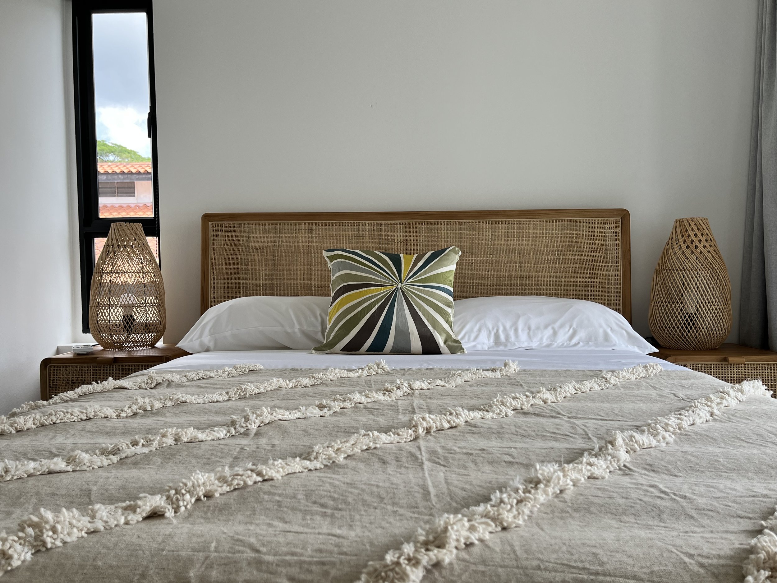 The only room in the same building where the yoga studio and roof terrace is. It is also where I and our housekeeper have our rooms. It is a little older than the other 4 yet makes for very comfortable living. Plenty of storage, fan, aircon and open views. Very spacious room.