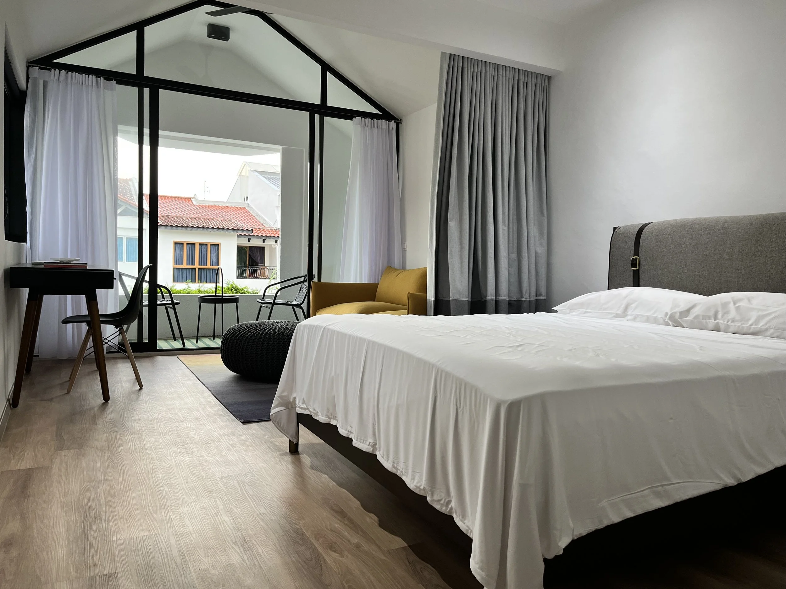 The largest of our four rooms, The Suite features a private living/study space, and a large balcony overlooking the pool and garden.