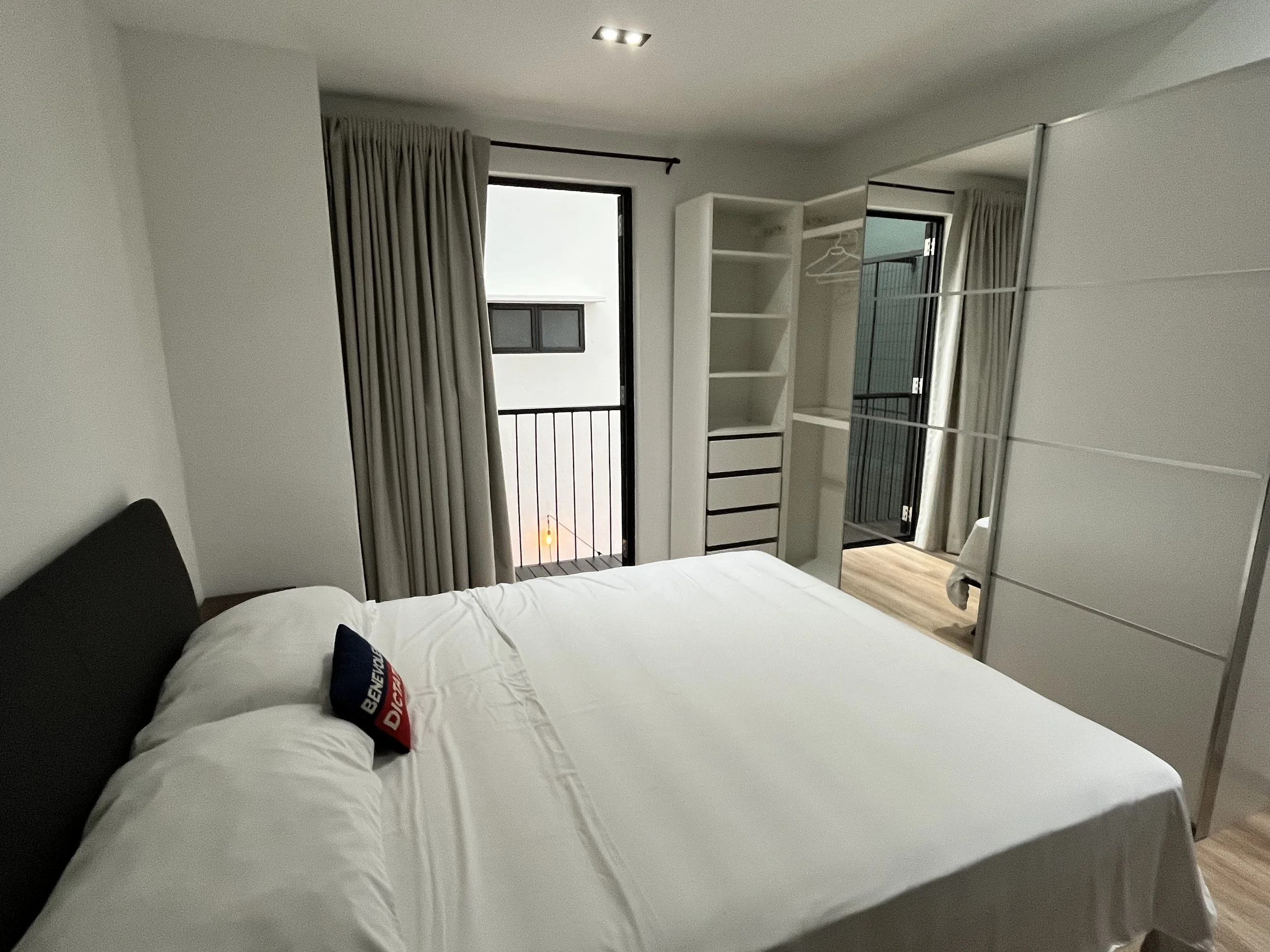 Double futon mattress, private bathroom, wardrobe, juliette balcony, separate living space.