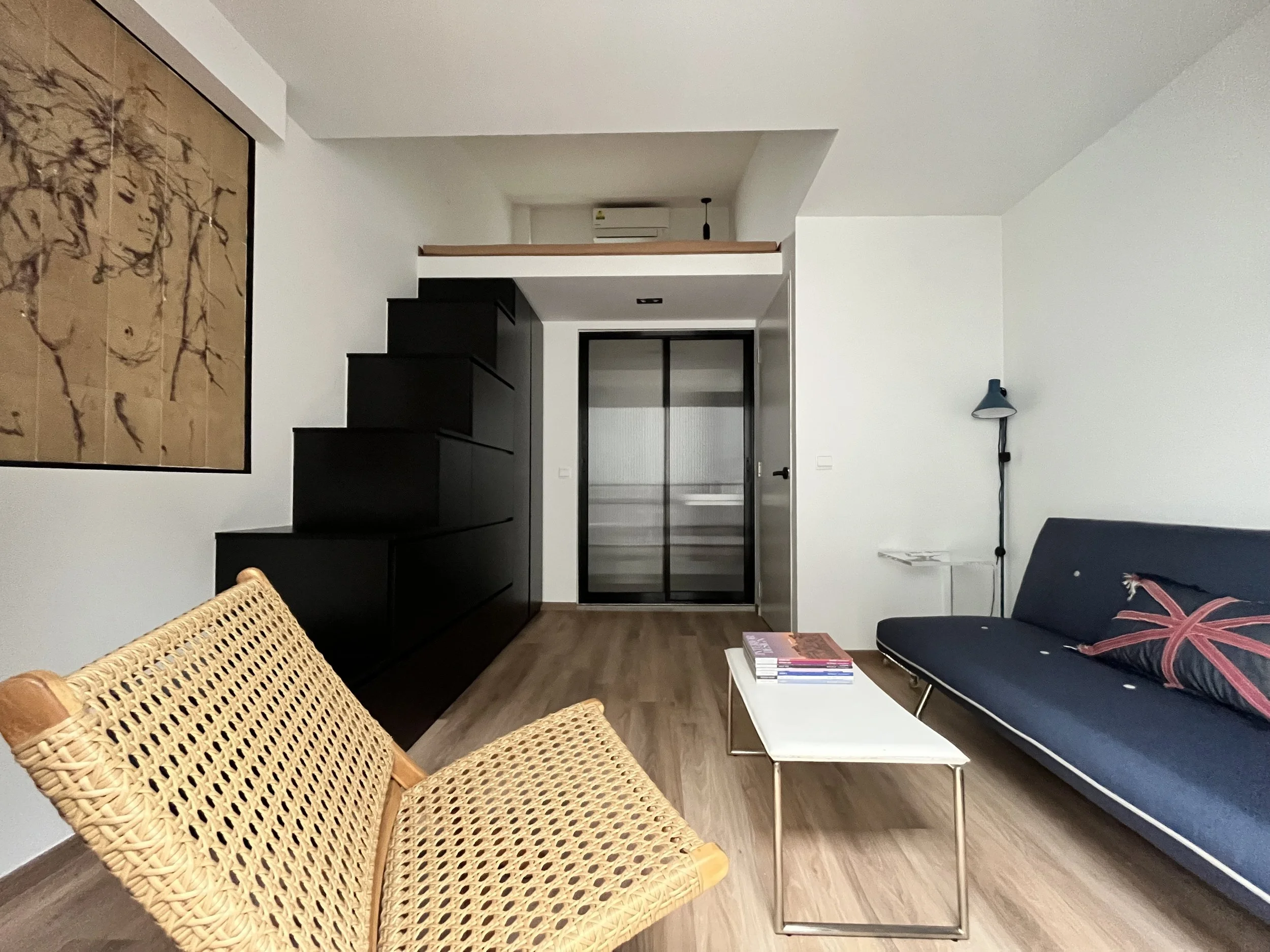 A lovely little room with a living space and a sleeping loft. We’ve kept a portion of the 70s wall tile as a reminder of the home’s past. A juliette balcony complete your experience. Faces inner courtyard.